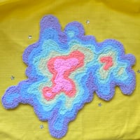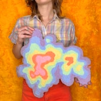 Vibrant colors and soft textures mean this artwork is a pleasure to view and to touch. This piece measures 19 inches by 18 inches at its widest points. A small ring attached to the back makes hanging a breeze. Made with natural and synthetic fibers.